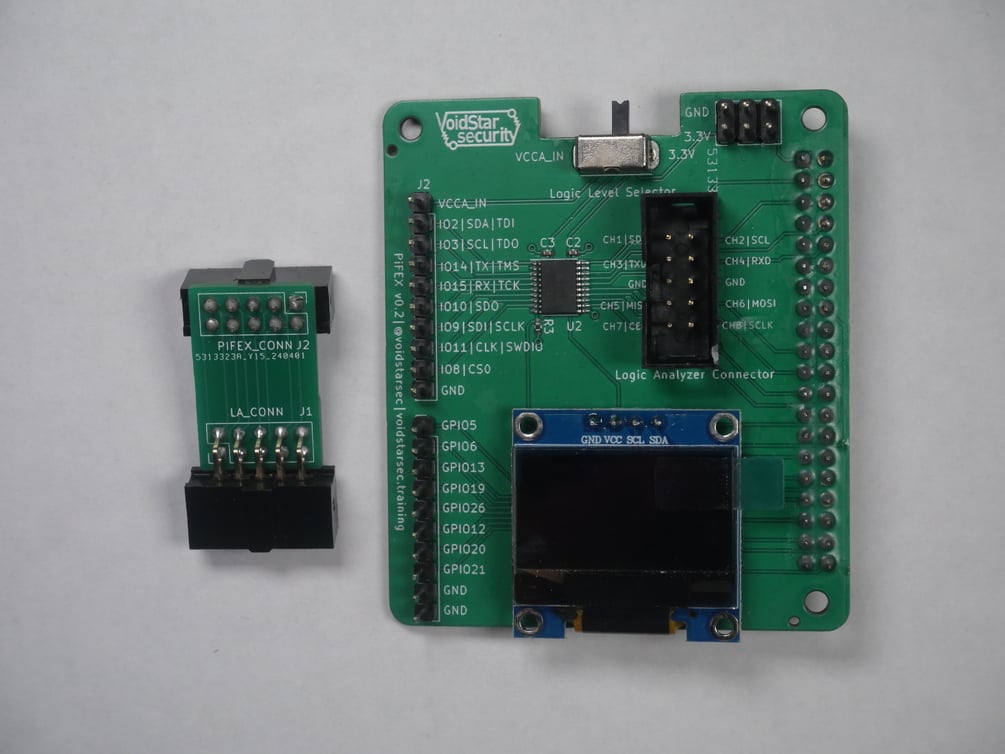 The Pi Interface Explorer or PiFex, is a simple hat for a Raspberry Pi designed for tinkerers and hardware hackers alike. By breaking out the commonly used interfaces and routing them through a bi-directional level shifters, we aimed to streamline some of the initial steps when reverse engineering a new device or trying to learn how a new sensor works.
